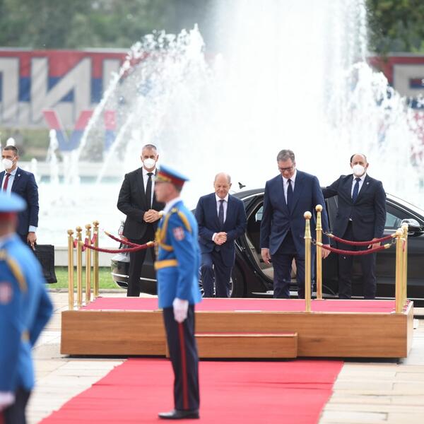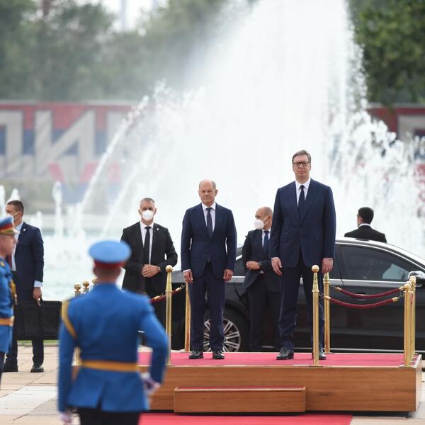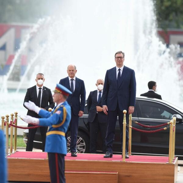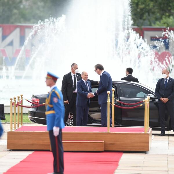 Nakon intoniranja himni dve zemlje i predaje raporta, predsednik Srbije Aleksandar Vučić i Olaf Šolc su ušli u palatu, gde će biti održani sastanci dve delegacije.