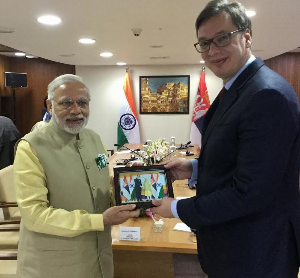 Sa njim je razgovarao o bilateralnim odnosima, jačanju ekonomske saradnje i trgovinske razmene. Premijer Vučić pozvao je premijera Modija da poseti Srbiju, istakavši da bi to bio novi impuls jačanju saradnje dveju zemalja na svim nivoima. Dvojica sagovornika razgovarali su o unapređenju saradnje u oblasti prehrambrene proizvodnje, poljoprivrede, farmacije, namenske industrije, turizma i informacionih tehnologija.