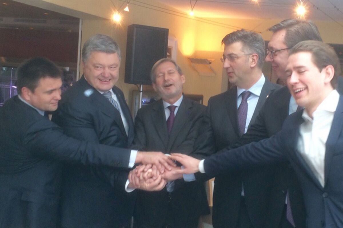 Fotografija na kojoj su Vučić, austrijski šef diplomatije Sebastijan Kurc, hrvatski premijer Andrej Plenković, Ukrajinci Pavlo Klimkin i Petro Porošenko sa evropskim komesarom Johanesom Hanom, objavljena je na Hanovom tviter nalogu.