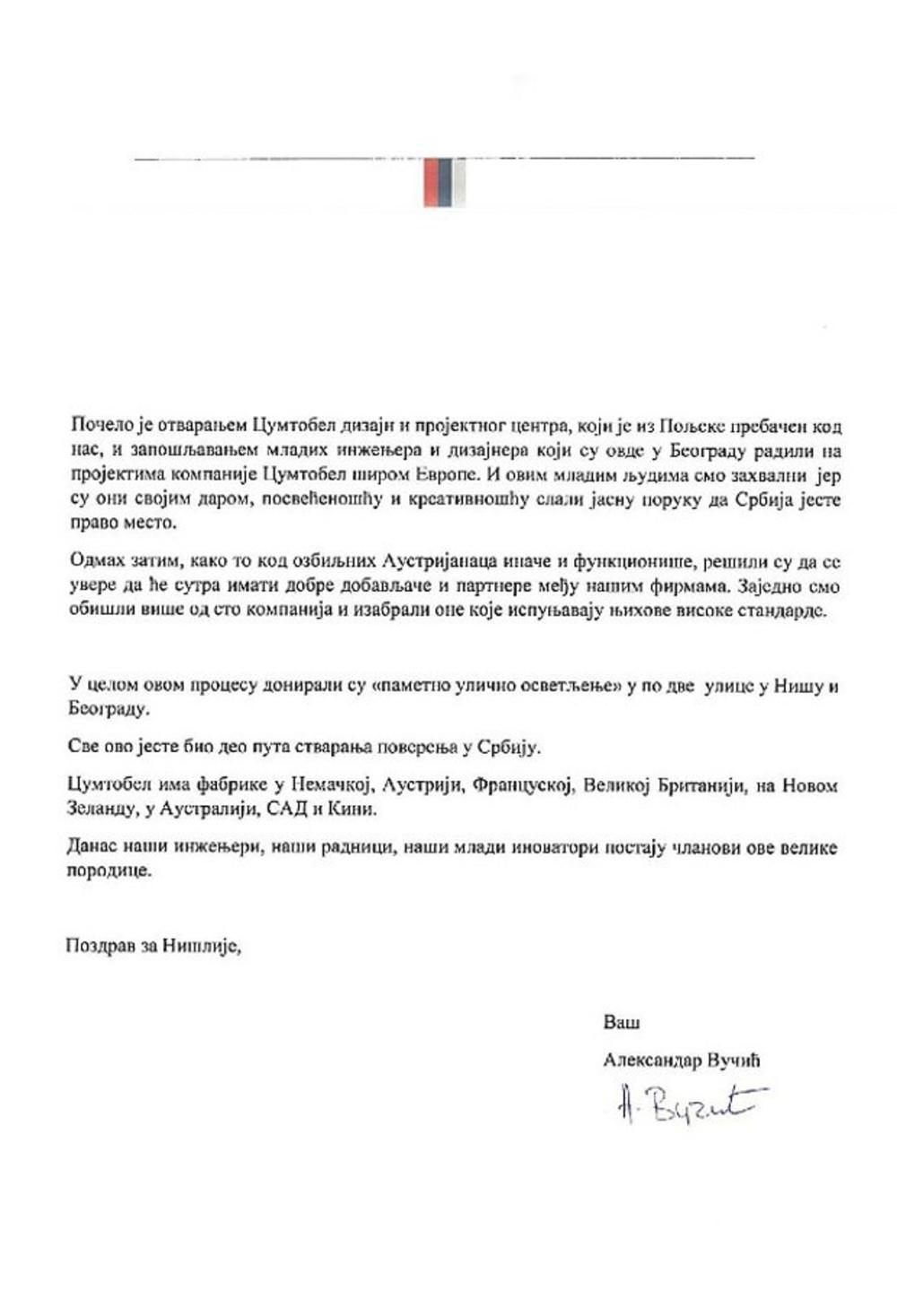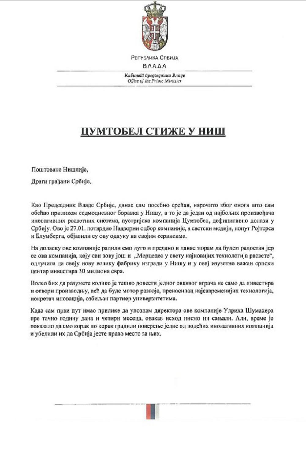 Kao predsednik Vlade Srbije, danas sam posebno srećan, naročito zbog onoga što sam obećao prilikom sedmodnevnog boravka u Nišu, a to je da jedan od najboljih proizvođača inovativnih rasvetnih sistema, austrijska kompanija "Cumtobel", definitivno dolazi u Srbiju. Ovo je 27. januara potvrdio Nadzorni odbor kompanije, a svetski mediji, poput "Rojtersa" i "Blumberga", objavili su ovu odluku na svojim servisima.