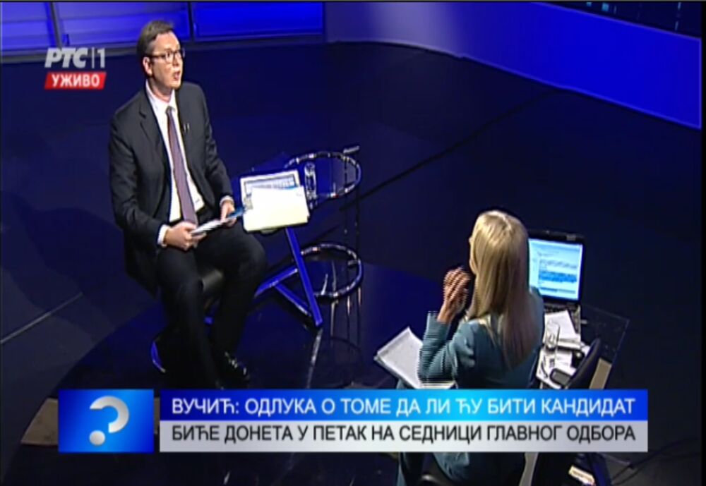Premijer Srbije i lider naprednjaka Aleksandar Vučić, koji je zvanično kandidat Srpske napredne stranke za predsednika Srbije, večeras je gost u emisiji "Upitnik" na RTS - u. On je rekao da je dobro za budućnost Srbije da bude kandidat za predsednika.