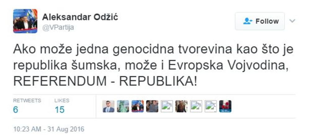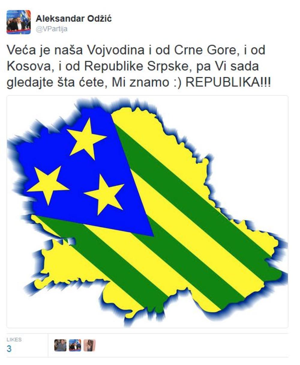 Uz usklik "REPUBLIKA!!!", Odžić je postavio i mapu nezavisne Vojvodine, sa nekim drugim državnim obeležjima, ali je i ovaj tvit uskoro obrisao.