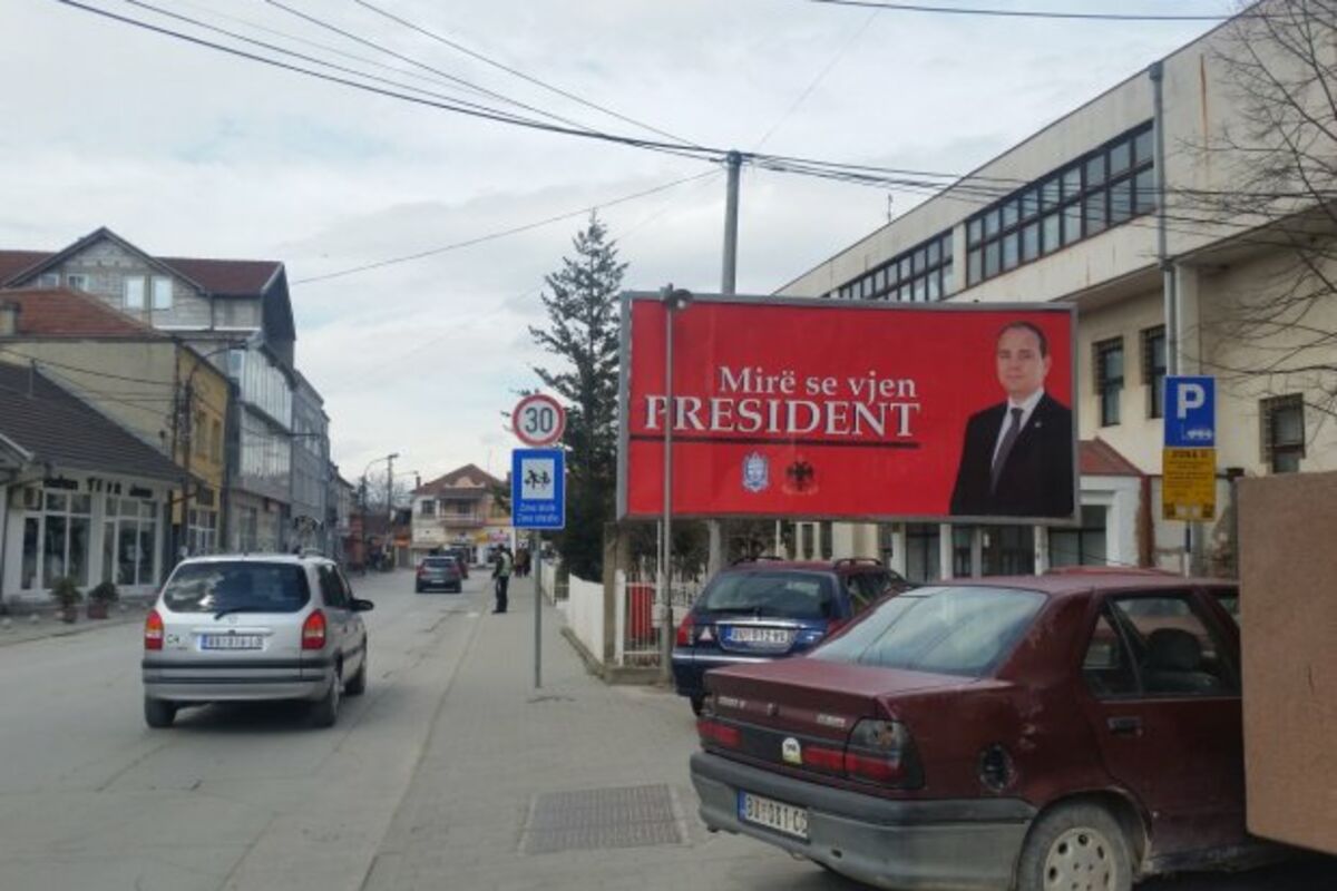Predsednika Albanije Bujara Nišanija Bujanovac dočekuje velikim bilbordom na kome je lik albanskog predsednika i poruka na albanskom jeziku.