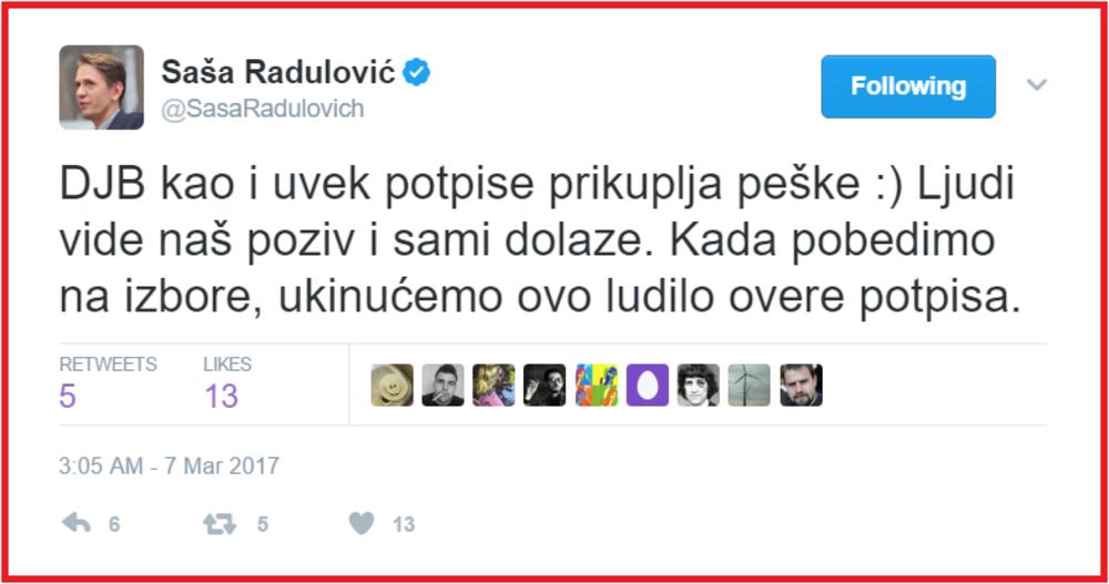 - DJB kao i uvek potpise prikuplja peške :) Ljudi vide naš poziv i sami dolaze. Kada pobedimo na izbore, ukinućemo ovo ludilo overe potpisa.