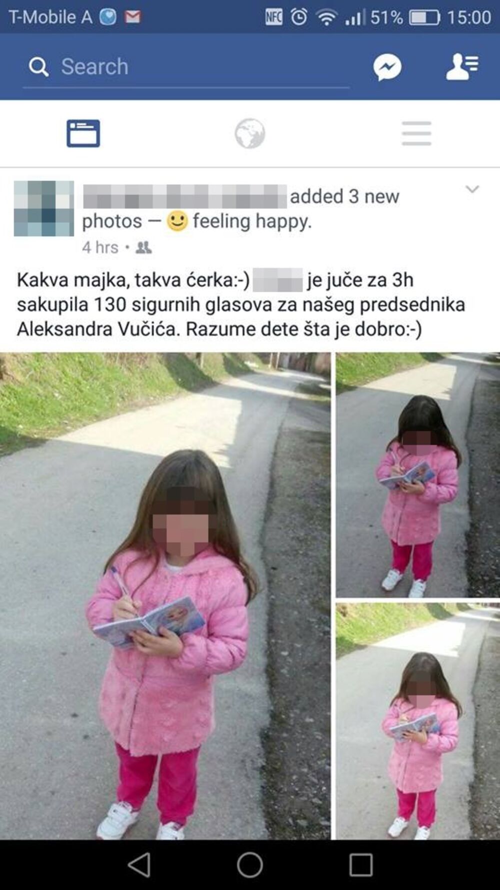 Ali, ovakav slučaj, čini nam se, nismo imali do sada. Naime, jedna žena se na Fejsbuku pohvalila kako je u sakupljanju glasova učestvovala i njena maloletna ćerka.