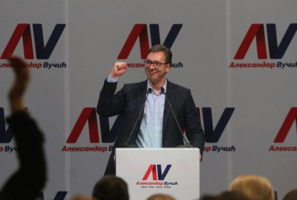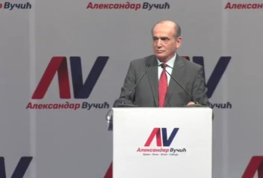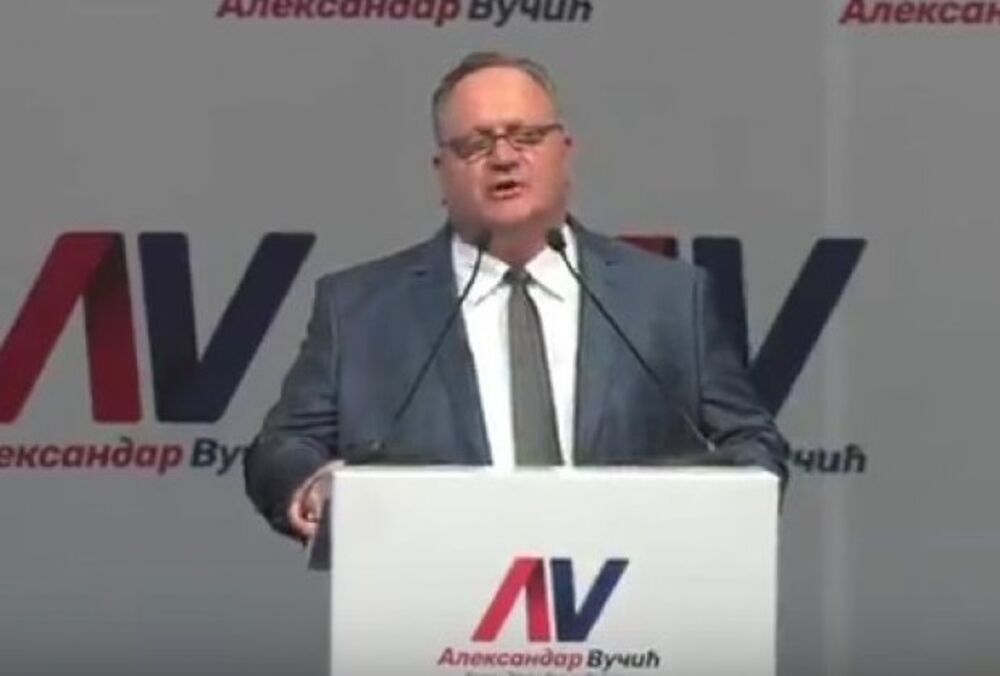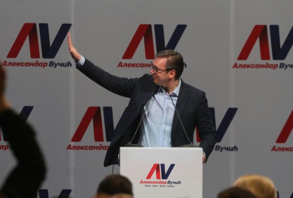 18.35 Na binu izlazi Aleksandar Vučić, praćen gromoglasnim aplauzom i skandiranjem "Vučić, Vučić!" i "Pobeda, pobeda!".