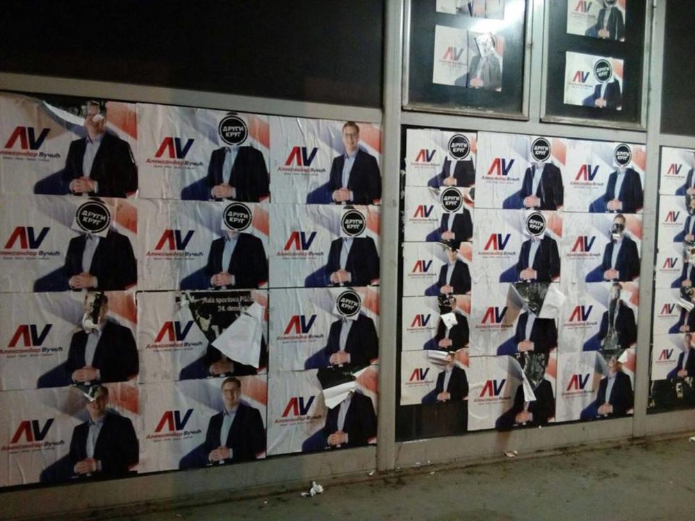 Međutim, ti plakati se prepoznaju samo po Vučićevom imenu i sloganu, jer je njegovo lice prekriveno nalepnicom "Drugi krug" (i na par mesta "Šešelj predsednik").