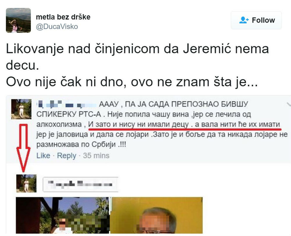 Ipak, iako su je mnogi osudili što je iznela lične stvari, navodno radi kampanje, izgleda da su se i Srbi na društvenim mrežama "zaigrali". Tako je jedan od korisnika Fejsbuka žestoko izvređao Natašu Jeremić, i to zbog činjenice da se nije još uvek ostvarila kao majka.