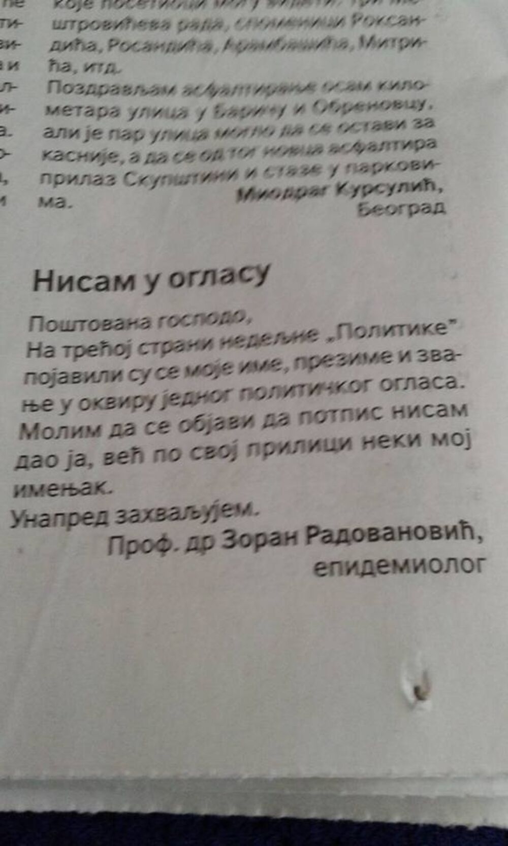 U jučerašnjem broju ovog lista objavljen je demanti sa naslovom "Nisam u oglasu". Epidemiolog prof. dr Zoran Radovanović napisao je da se na trećoj strani nedeljne Politke pojavilo njegovo ime, prezime i zvanje u okviru jednog političkog oglasa. "Molim da se objavi da potpis nisam dao ja, već po svoj prilici neki moj imenjak", napisao je Radovanović.