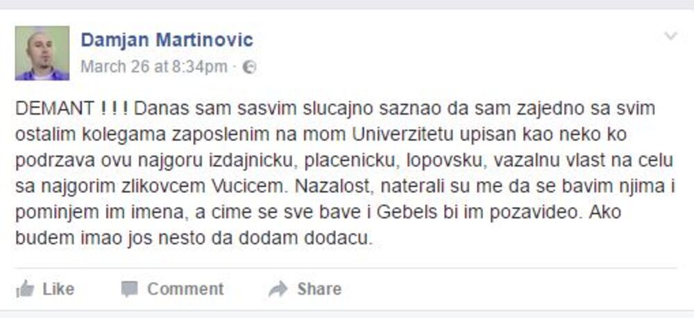 - Danas sam sasvim slučajno saznao da sam zajedno sa svim ostalim kolegama zaposlenim na mom Univerzitetu upisan kao neko ko podržava ovu najgoru, izdajničku, plaćeničku, lopovsku nazalsku vlast... - napisao je on na Fejsbuku, ali je zanimljivo da je status ubrzo "nestao".