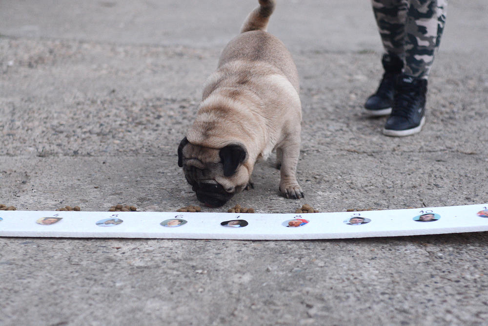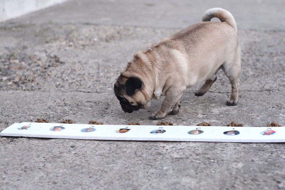 Sada smo uradili nešto drugačije. Mopsu čije je ime Čarli dali smo da "pogodi" ko će biti novi predsednik Srbije. Tablu od stiropora sa brojevima i njihovim glavama dali smo - našem Čarliju.