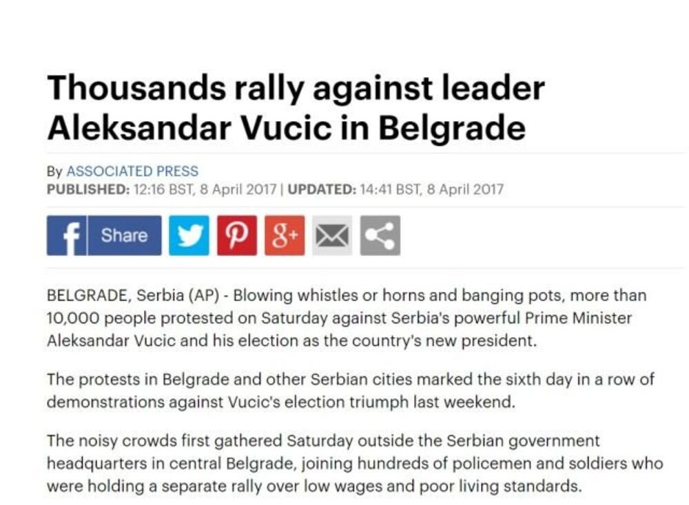 - Danas, 20 godina kasnije, u pištaljke duvaju deca tadašnjih demonstranata... instinktivno reagujući zastrašeni procentom od 55 odsto s koliko je Aleksandar Vučić izabran za predsednika Republike, viču da je glasove oteo kontrolom medija i demagogijom, a parola im je 'Protiv diktature - piše list.