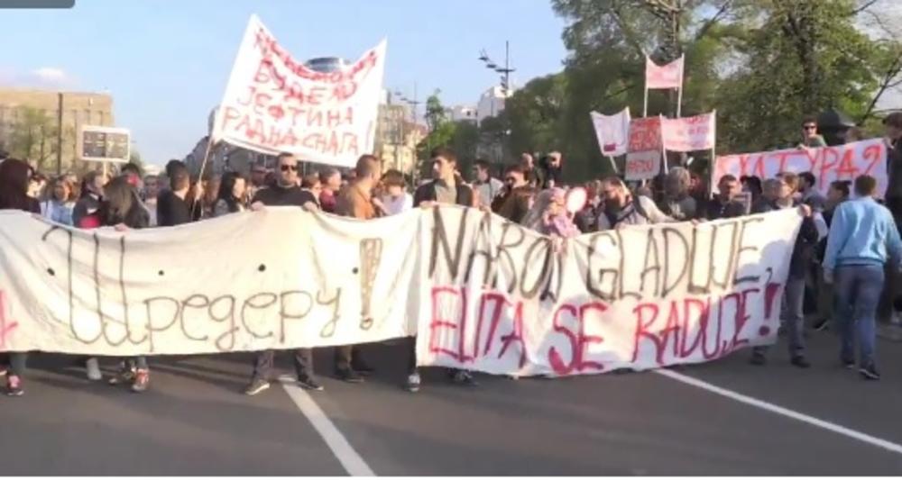 18:20 - Kao i proteklih dana, okupljeni nose transparente "Nećemo da budemo jeftina radna snaga", "Narod gladuje, elita se raduje".
