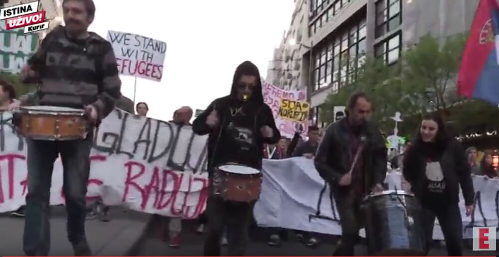 19:15 - Okupljeni pevaju "Onesvesti se", a povremeno se glasno čuje i "Izlazite napolje". Trenutno su zastali, pevaju i skaču. Momci sa bubnjevima kao i prethodnih dana podižu atmosferu i daju ritam masi koja ih prati.