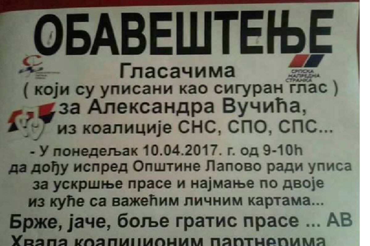 Svi koji su na izborima glasali za Aleksandra Vučića treba u ponedeljak, 10.4.2017. godine, od 9-10 časova da budu ispred zgrade opštine Lapovo, kako bi preuzeli svoje uskršnje prase.