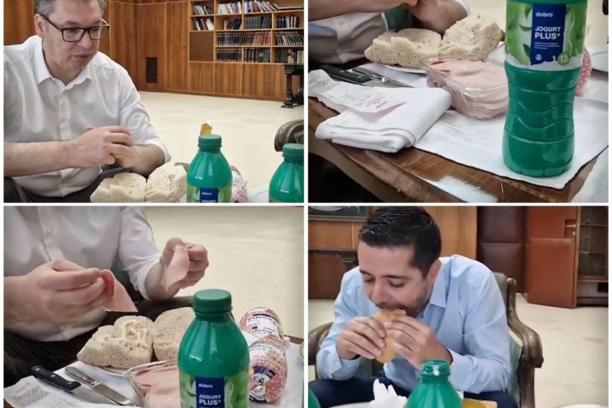 Kao što je i najavio pre par dana, predsednik Srbije Aleksandar Vučić je danas doručkovao četvrtku hleba, majonez i parizer, zajedno sa ministrom finansija Sinišom Malim i ministrom unutrašnje i spoljne trgovine Tomislavom Momirovićem. Video snimak je podelio na Instagramu, a kako je naveo, sastojke za sendvič su kupili Tomislav Momirović i Siniša Mali.