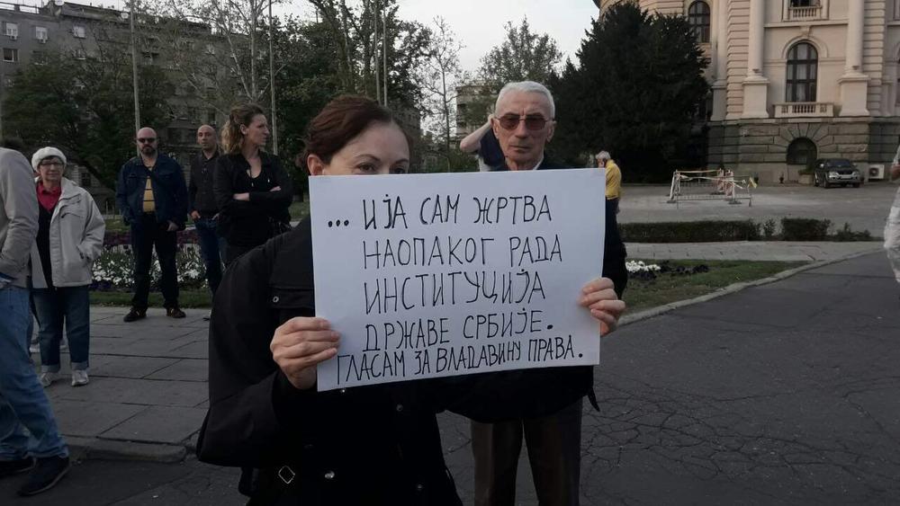 - I ja sam žrtva naopakog rada institucija države Srbije. Glasam za vladavinu prava - piše na jednom od transparenata.