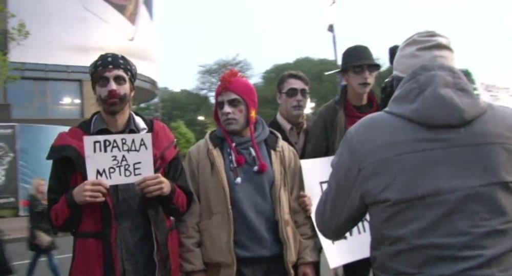 19.35 Deo učesnika protesta održao jeperformans u kome se bili našminkani kao mrtvaci i nosili transprent "Oduzmite nam pravo glasa", aludirajući na nesređene biračke spiskove, u kojima su i mrtvi.