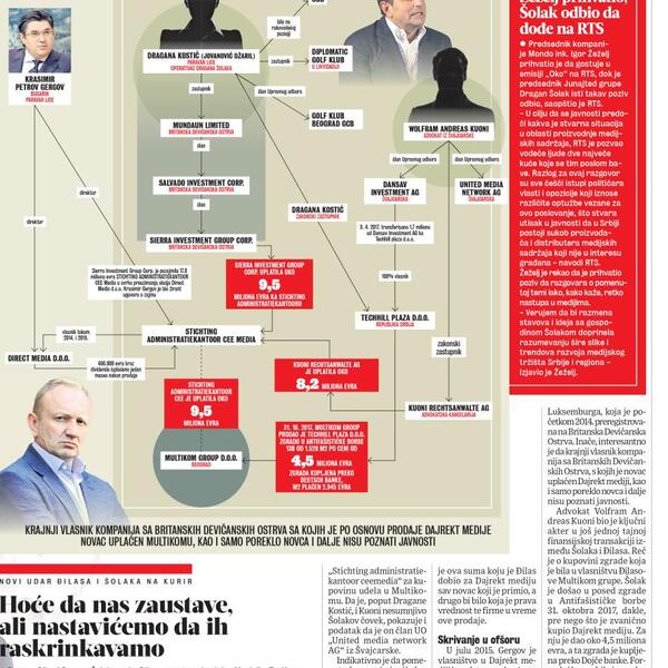 U serijalu tekstova pokazali smo zašto je prodaja Đilasove "Dajrekt medije" i zgrade "Multikoma" "Junajted grupi" tačka u kojoj se sagledava karakter političko-poslovnog savezništva Dragana Đilasa i Dragana Šolaka, teškog na desetine, a možda i stotine miliona evra. Ta saradnja bila je strogo čuvana tajna zbog toga što se iza nje krije komplikovana šema malverzacija. Kad se namerno zakomplikovan mehanizam kupovine i prodaje rastavi na delove i očisti od lažnih i podmetnutih elemenata, dobija se jasna slika da je Šolak još 2014. kupio "Dajrekt mediju" od Đilasove "Multikom grupe", što je skrivano i od tadašnjih suvlasnika "Junajted grupe" kako bi se izvlačile pare iz zajedničke kompanije.