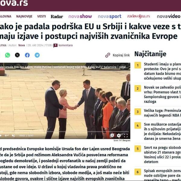 Kada predsednica Evropske komisije pohvali napredak Srbije u određenim segmentima, N1 i Nova S se utrkuju ko će da smisli zlobniji naslov i napiše tekst u kojem se Ursula fon der Lajen bukvalno optuži za trend pada podrške građana Srbije evropskim integracijama, pa je tako Nova S prošle godine, nakon njene posete Beogradu, napisala da "izjave najviših evropskih zvaničnika 'ubijaju' ionako nisku podršku naših građana evropskim integracijama", a naslov tog teksta je "Kako je padala podrška EU u Srbiji i kakve veze s tim imaju izjave i postupci najviših zvaničnika Evrope".