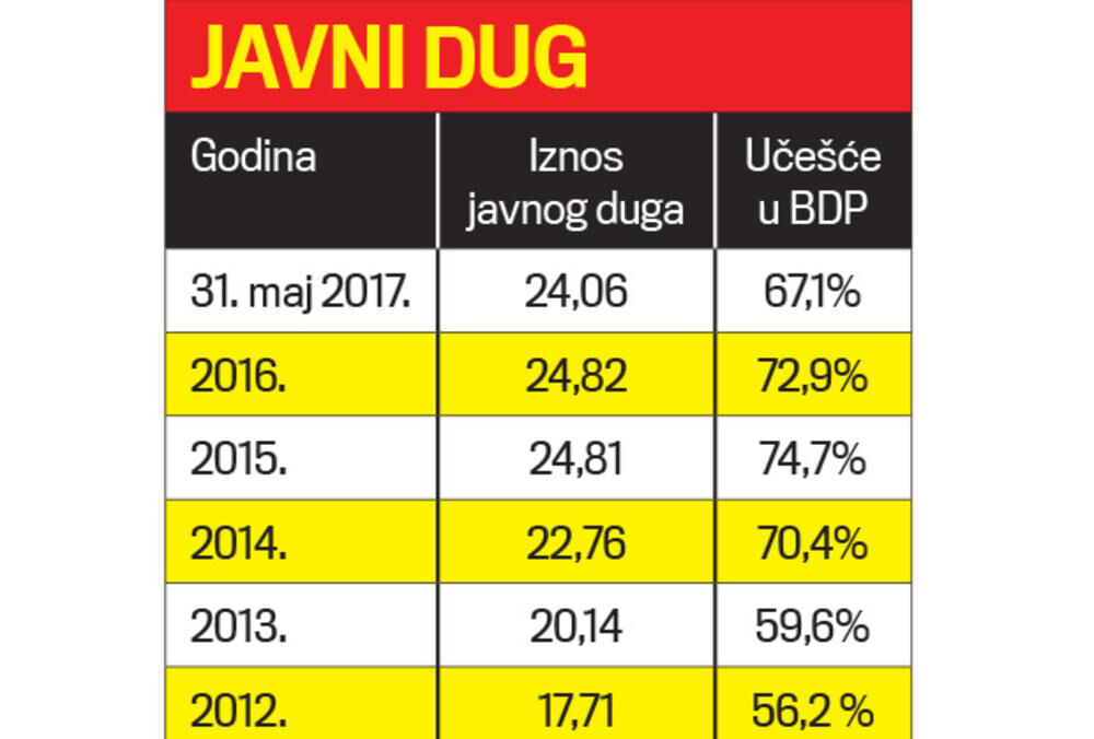 Istovremeno, učešće javnog duga u bruto društvenom proizvodu povećalo se sa 56,2 odsto, koliko je iznosio 2012, na čak 67,1 odsto BDP na kraju maja 2017.