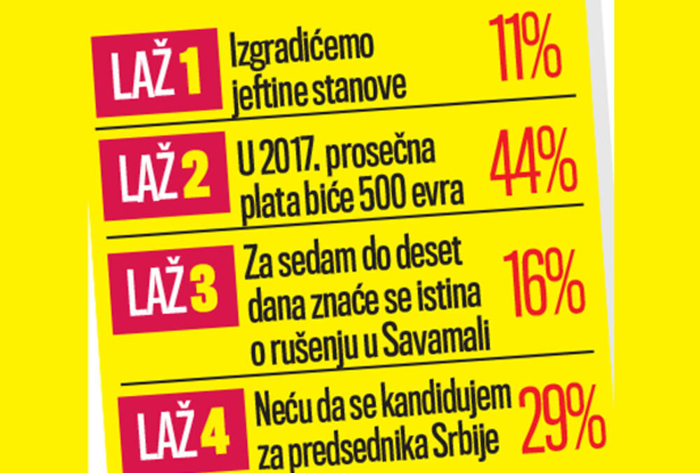 Ukoliko mislite da je naveća laž broj 1 (Izgradićemo jeftine stanove) u reakcijama ispod ankete pritisnite emotikon "haha". Da pobedi laž broj 2 (U 2017. prosečna plata biće 500 evra) pritisnite emotikon "wow", za laž broj 3 (Za 7 do 10 dana znaće se istina o rušenju u Savamali) pritisnite emotikon "angry", a za laž broj 4 (Neću da se kandidujem za predsednika Srbije) emotikon "sad"