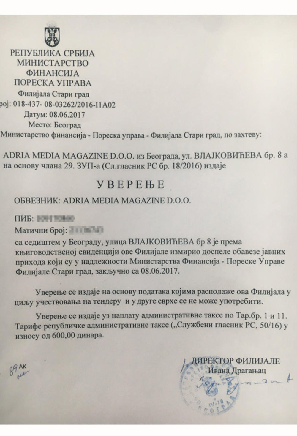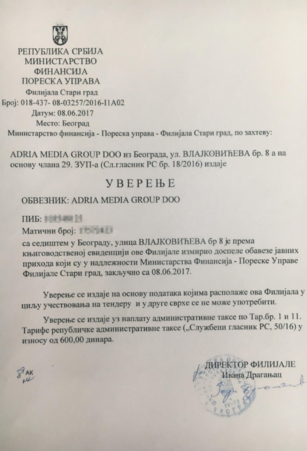 DOKAZ BROJ 1 - Uverenje od 8. juna 2017. da je Adrija medija grupa izmirila sva poreska dugovanja prema državi Srbiji