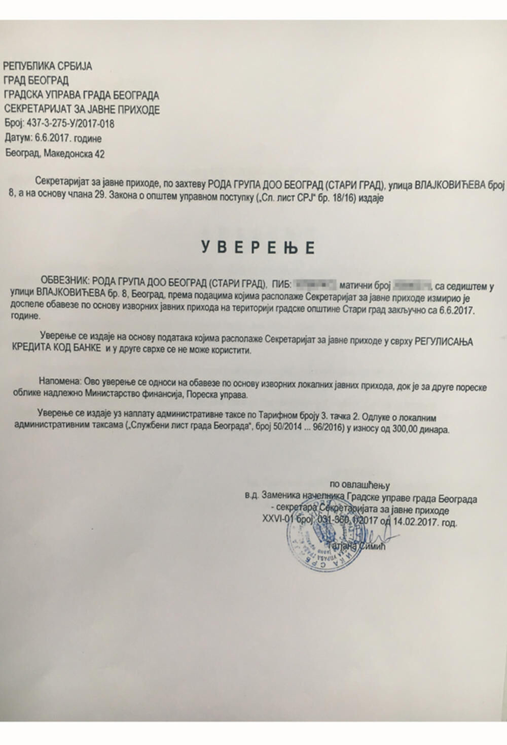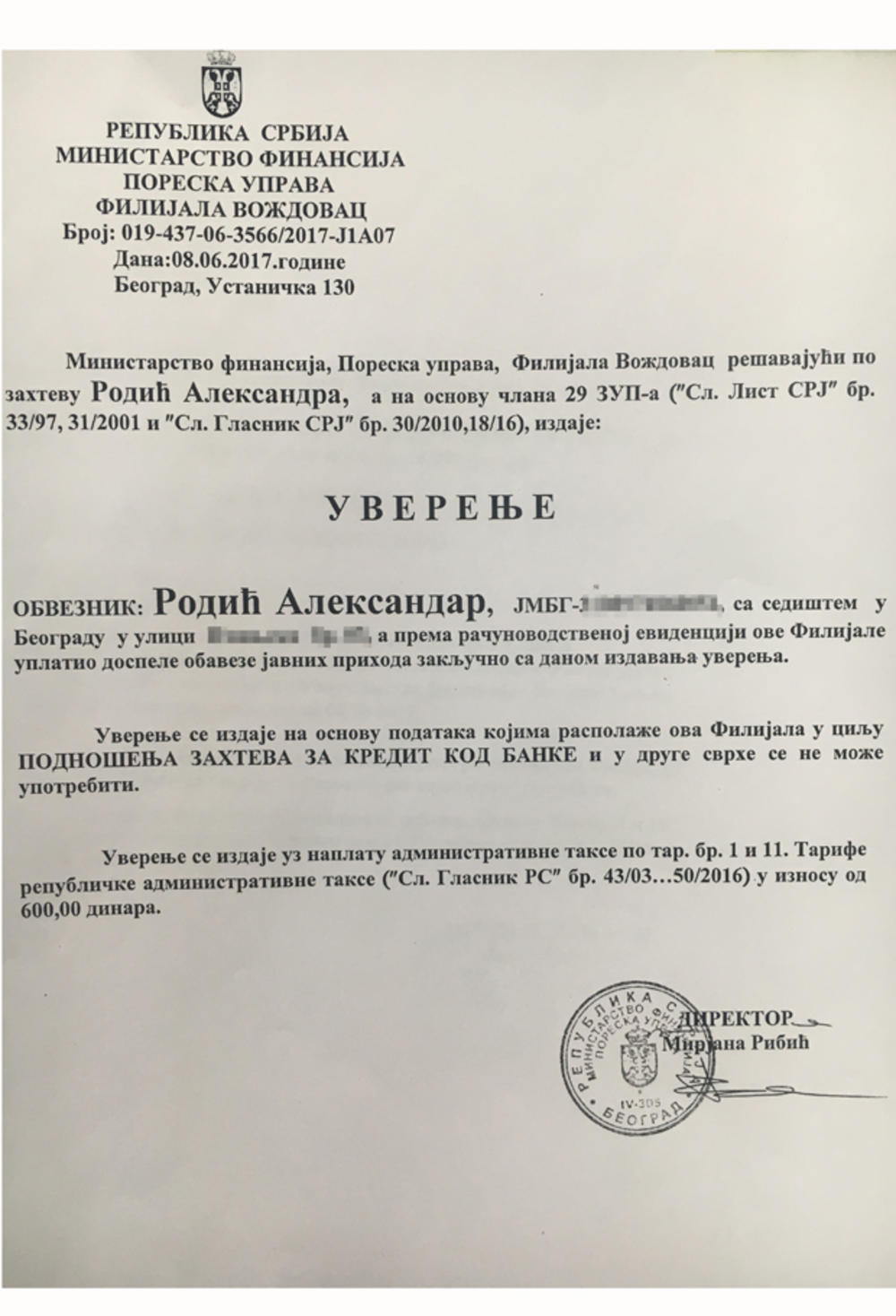 DOKAZ 3 - Uverenje od 8. juna da Aleksandar Rodić ne duguje za porez