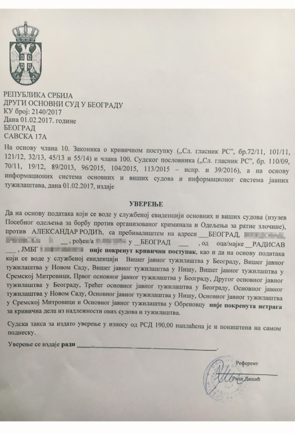 DOKAZ 4 - Uverenje od 1. februara da se protiv Aleksandra Rodića, predsednika AMG, ne vodi krivični postupak pred bilo kojim organom u Republici Srbiji
