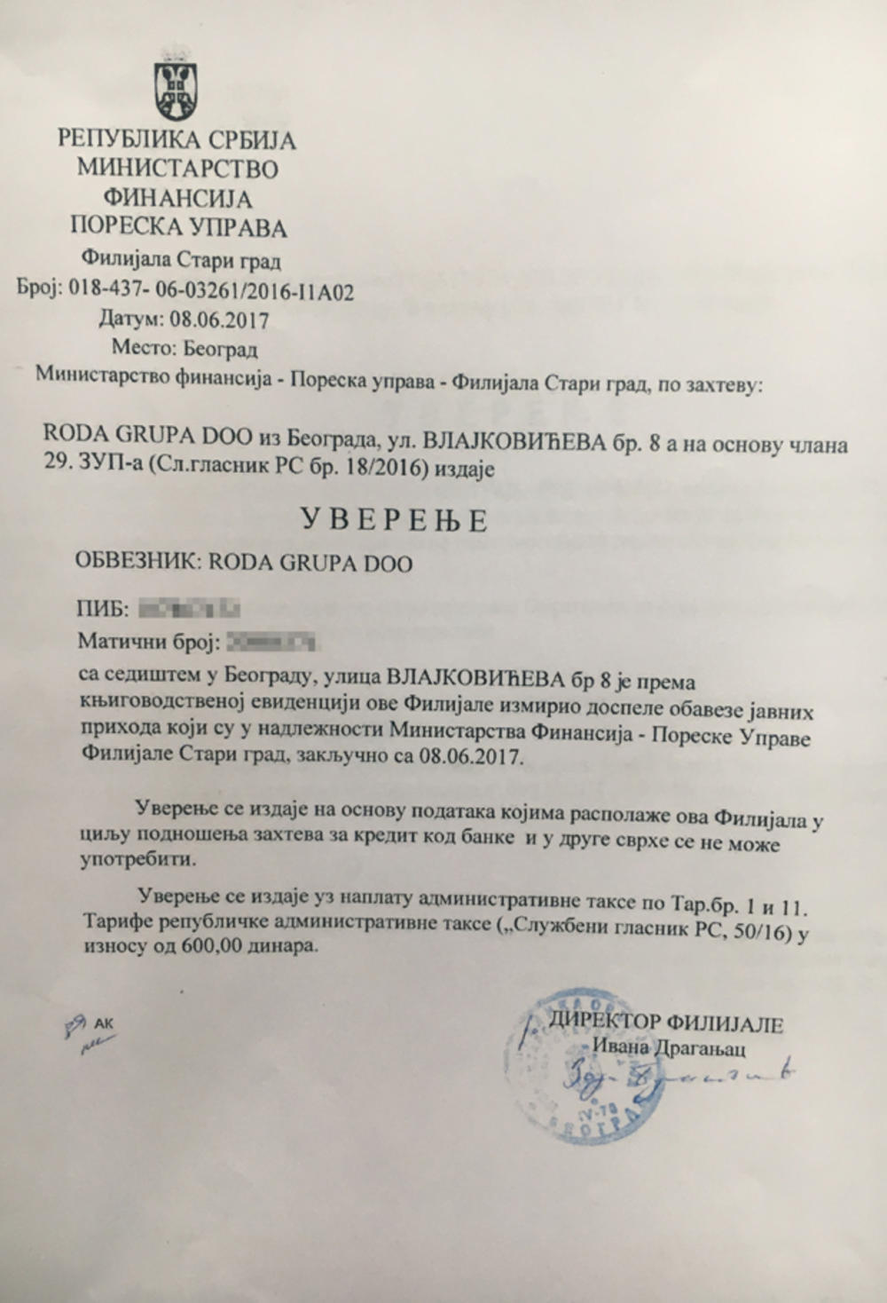 Pre samo 15 dana, "Adrija medija grupa" (AMG) Aleksandra Rodića i sve firme u vlasništvu porodice Rodić dobile su zvanična uverenja od Poreske uprave Ministarstva finansija Republike Srbije da su izmirile sve obaveze koje su u nadležnosti Poreske uprave.