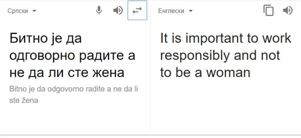 I zaista, kad ovu frazu nestručno iskopirate na ovaj Guglov alat, koji nikako nije potpuno precizan (ali to bi ljudi na ozbiljnim pozicijama trebalo da znaju), i mi smo dobili rezultat: da ne treba da budete žena!