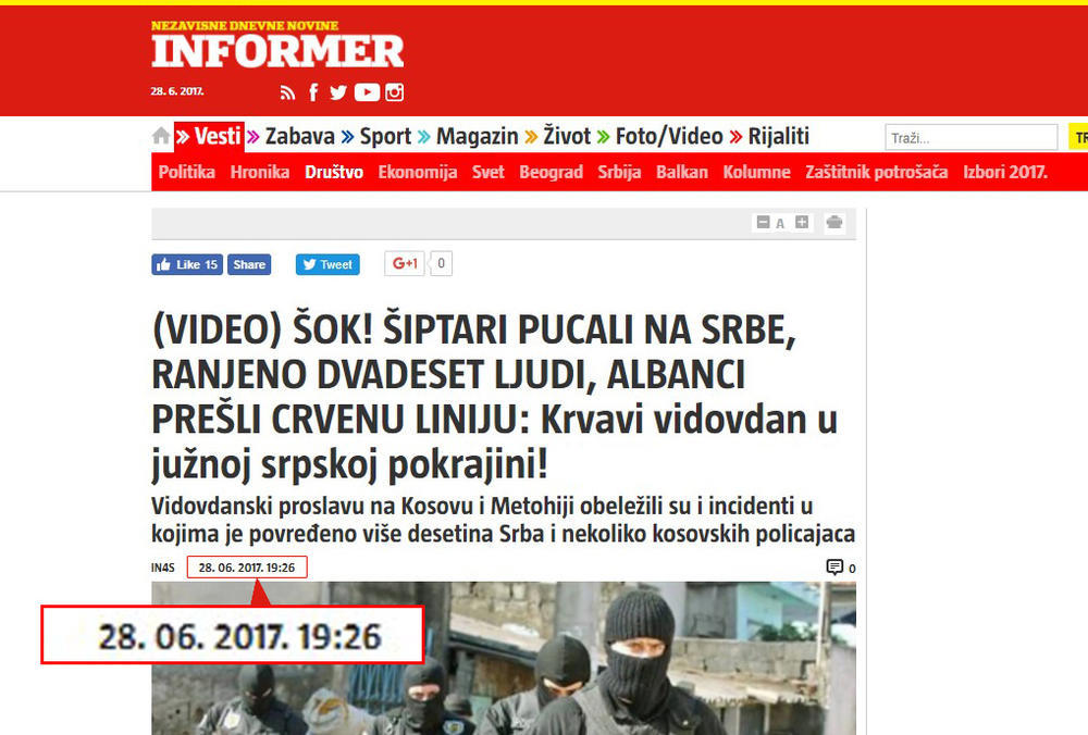 Nepismeni urednik Vučićevog SNS Informatora, troglodit Dragan. J. Vučićević, uznemirio je večeras celu Srbiju, pošto je na svom portalu objavio vest da je tokom današnjeg obeležavanja Vidovdana na Kosovu i Metohiji došlo do ORUŽANIH SUKOBA (?!) u kojima je teže povređeno oko 20 Srba i nekoliko policajaca!