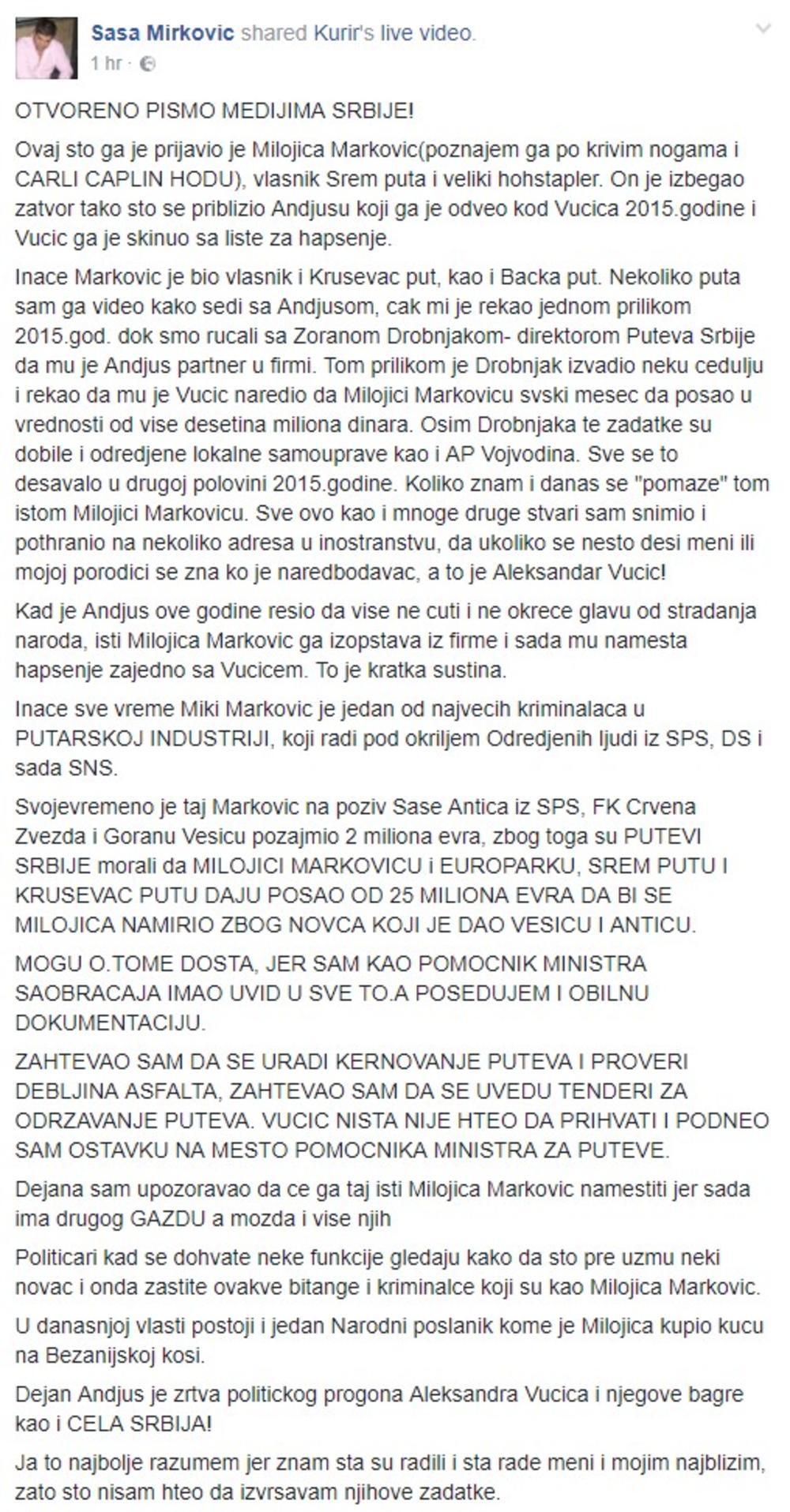 - Inače Marković je bio vlasnik i "Kruševac put", kao i "Bačka put". Nekoliko puta sam ga video kako sedi sa Anđusom, čak mi je rekao jednom prilikom 2015.godine dok smo ručali sa Zoranom Drobnjakom, direktorom Puteva Srbije, da mu je Anđus partner u firmi. Tom prilikom je Drobnjak izvadio neku cedulju i rekao da mu je Vučić naredio da Milojici Markoviću svaki mesec da posao u vrednosti od više desetina miliona dinara. Osim Drobnjaka te zadatke su dobile i određene lokalne samouprave kao i AP Vojvodina. Sve se to dešavalo u drugoj polovini 2015.godine. Koliko znam i danas se "pomaže" tom istom Milojici Markoviću. Sve ovo kao i mnoge druge stvari sam snimio i pothranio na nekoliko adresa u inostranstvu, da ukoliko se nešto desi meni ili mojoj porodici se zna ko je naredbodavac, a to je Aleksandar Vučić - objašnjava Mirković.