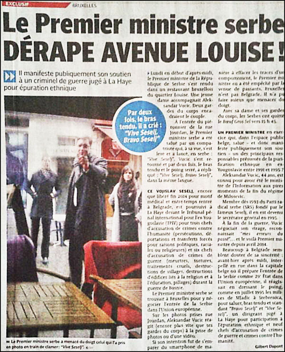 U tekstu pod naslovom “Srpski premijer izgubio kontrolu u Aveniji Luis“, novinari novina “La Derniere Heure” navode da je premijer Srbije pretio prolaznicima koju su ga snimali kako briselskim ulicama uvikuje “Živeo Šešelj! Bravo Šešelj!”.