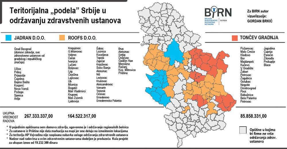 Prema podacima koje je sakupio BIRN, Ministarstvo zdravlja Republike Srbije dodelilo je preko tendera, u decembru 2015. godine, posao adaptacije "mokrih čvorova" preduzećima Jadran AD, Roofs, Tončev gradnja i Noveco.