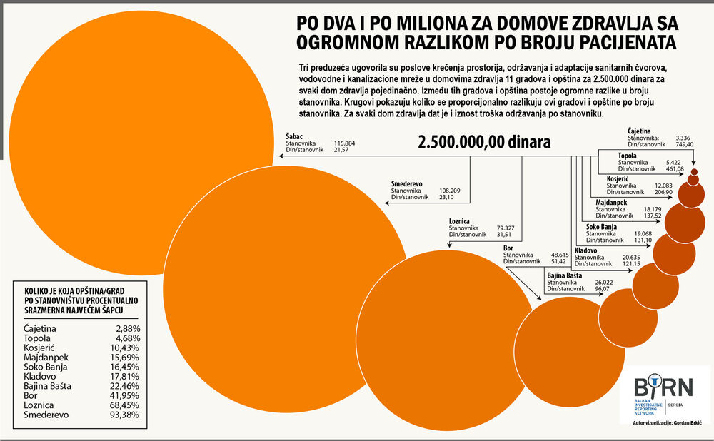 Osim što je, sa jedne strane, u velikom broju slučajeva "pogođene" u dinar, cena nije ni srazmerno proporcionalna obimu posla, te su ove firme naplaćivale posao sanacije za manje zdravstvene ustanove u manjim opštinama u identičnom iznosu kao za one u znatno većim, kada se kao merilo uzme odnos uloženog novca sa brojem stanovnika kojima je potrebno poboljšati uslove lečenja u zdravstvenoj ustanovi.
