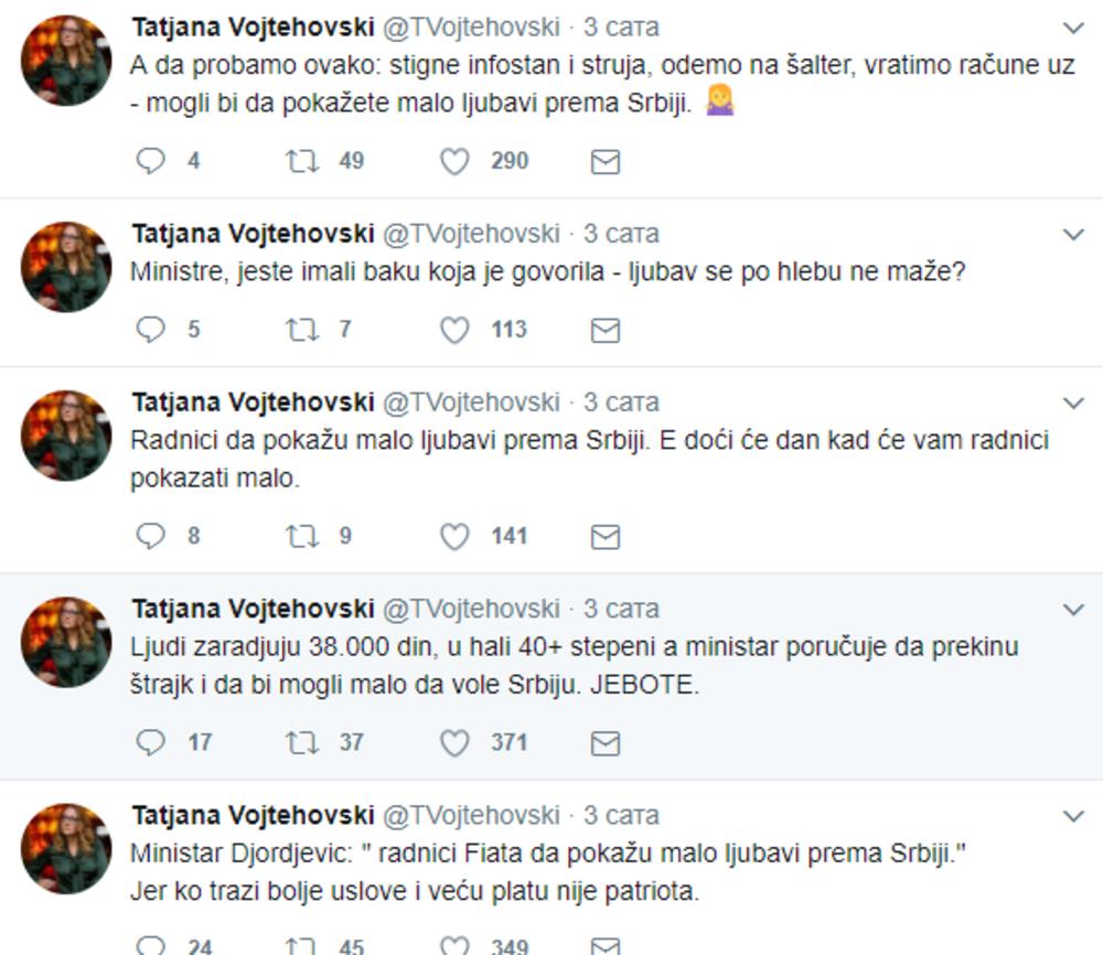 Rečenica minsitra rada koja nije bila na mestu, prokomentarisala je i Tatjana Vojtehovski koja je nizom tvitova izrazila svoje čuđenje i nevericu zbog onoga što je Đorđević rekao.
