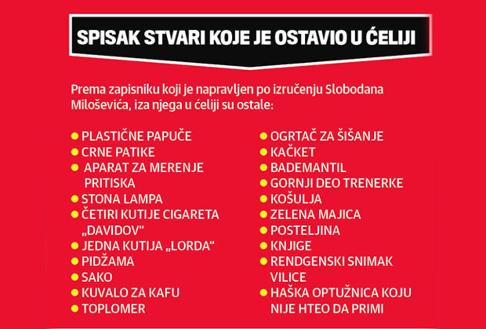 - Ustanite i spremite se - kratko i vojnički se tadašnji upravnik zatvora Dragiša Blanuša oko 18 sati obratio Miloševiću, kog je zatekao kako u pidžami leži i čita knjigu. - Gde idemo? Kuda me vodite? - bio je iznenađen. - U Hag - kratko mu je odgovorio Blanuša. Milošević je lagano ustao i zamolio: - Upravniče, dozvolite bar da se javim supruzi, advokatima, da spakujem svoje stvari.