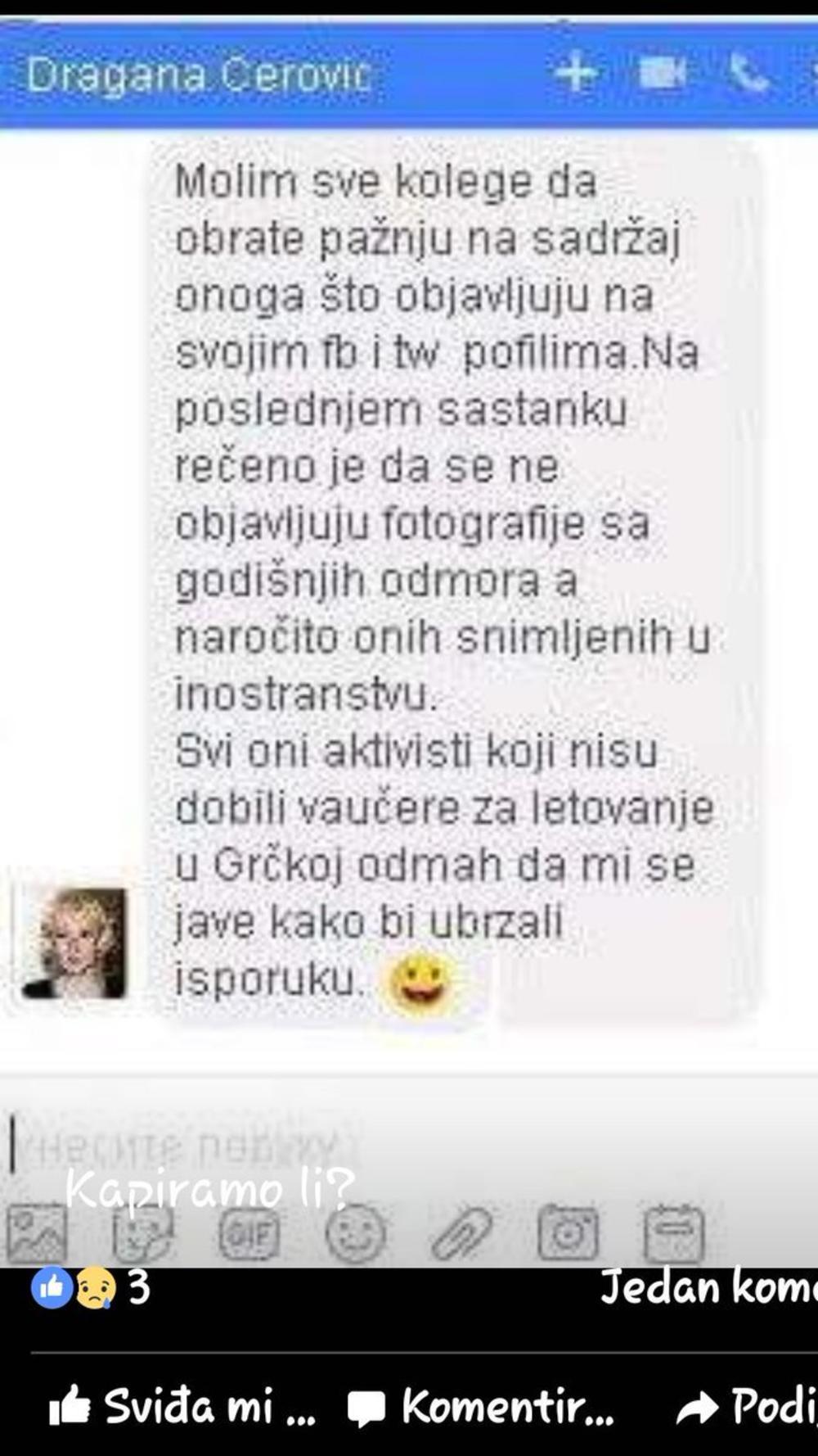 " Molim sve kolege da obrate pažnju na sadržaj onoga što objavljuju na svojim Fejsbuk i Tviter profilima. Na poslednjem sastanku rečeno je da se ne objavljuju fotografije sa godišnjih odmora, a naročito onih snimljenih u inostranstvu. Svi oni aktivisti koji nisu dobili vaučere za letovanje u Grčkoj odmah da mi se jave kako bi ubrzali isporuku, napisala je ona u Fejsbuk poruci botovima, koja je isplivala.