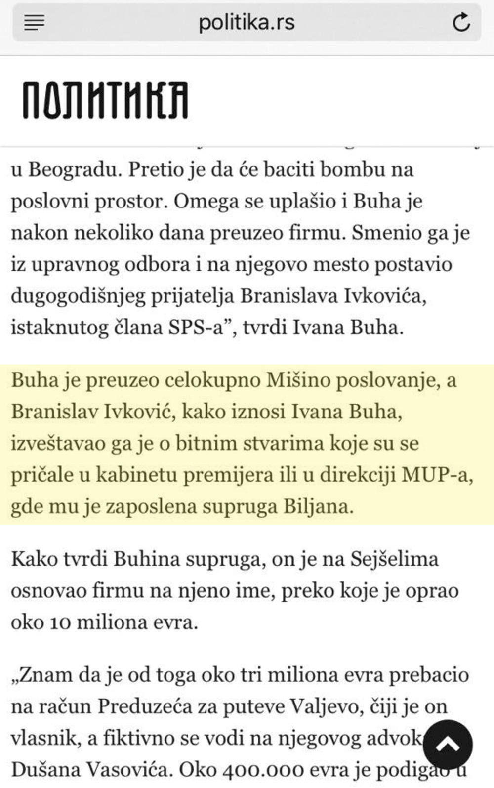 - Tužilaštvo bi trebalo da reaguje na osnovu tvrdnji bivše supruge Ljubiše Buhe i naloži policiji mere u vezi s tim. Gospođa Popović Ivković od dana kad je postavljena na funkciju državnog sekretara MUP ne ispunjava svoje radne obaveze, nego od početka do danas daje političke izjave i štiti ministra. Takvo ponašanje bilo bi razumljivo da dr Nebojša vodi privatnu kompaniju, pa da gospođa Ivković štiti interese vlasnika. Međutim, MUP je državna, da kažem narodna institucija i narod plaća gospođu Ivković, a ne dr Nebojša. Iz svega možemo zaključiti da je dr Nebojša privatizovao MUP i da radi šta mu se prohte. Nepotizam, politizacija i upropašćavanje MUP nastavlja se punom snagom - ocenjuje Mijailović za Kurir.