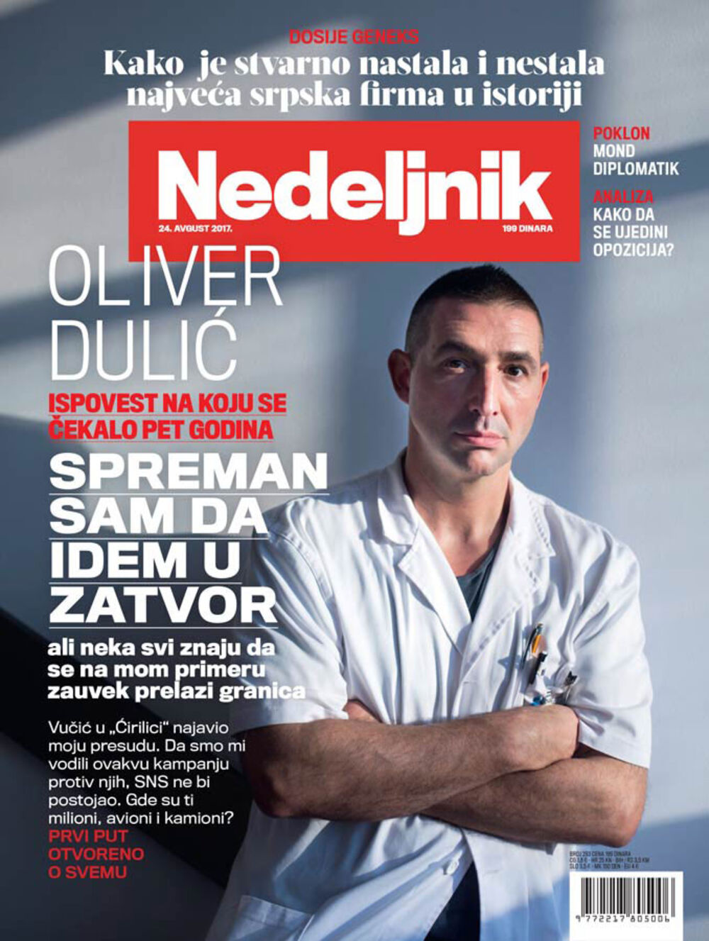 Oliver Dulić je u velikoj ispovesti za najnoviji Nedeljnik koji je na kioscima od 24. avgusta prvi put posle presude Specijalnog suda u Beogradu, kada je proglašen krivim za zloupotrebu položaja i osuđen na tri i po godine zatvora, pričao o sudskom procesu, optužbama na njegov račun, osveti političkih protivnika, kao i o odlasku DS-a sa vlasti, porazu Borisa Tadića, formiranju Srpske napredne stranke i usponu Aleksandra Vučića, o Đilasu, šta je naučio od Đinđića, medijskim optužbama, koliko je na njegovu političku karijeru uticalo to što se izjašnjava kao Jugosloven, te da li planira da se vrati u politiku.