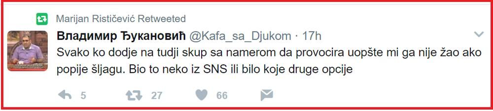 - Svako ko dodje na tuđi skup sa namerom da provocira uopšte mi ga nije žao ako popije šljagu. Bio to neko iz SNS ili bilo koje druge opcije - napisao je on.