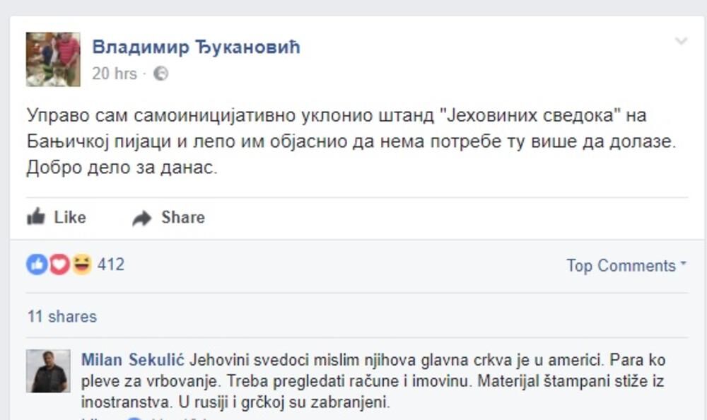 On je pre nekoliko dana na Fejsbuku napisao da je da je "samoinicijativno" uklonio štand Jehovinih svedoka sa Banjičke pijace, i pohvalio se da je time učinio dobro delo.