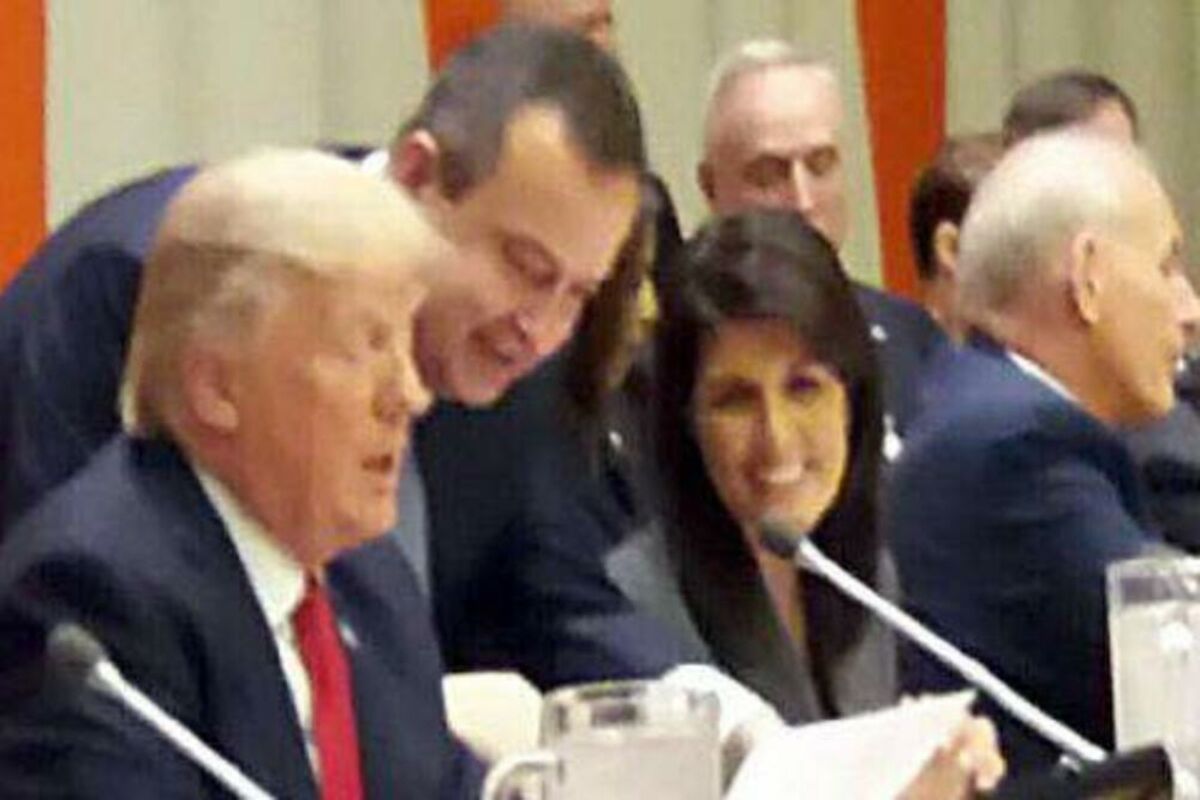 Za sada nije poznato o čemu je Dačić razgovarao sa predsednikm SAD, ali na fotografijama sastanka u UN se vidi da je Dačić bukvalno zaskočio Trampa i nešto mu govorio na uvo, dok se ambasadorka SAD u Ujedinjenim nacijama Niki Hejli srdačno smejala.