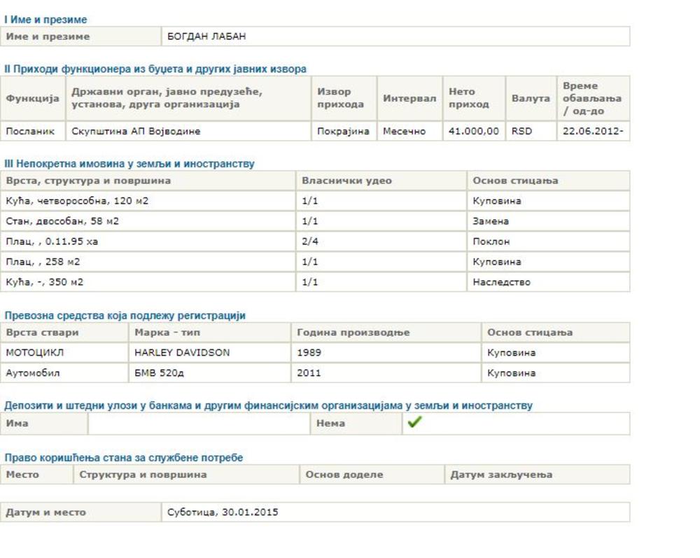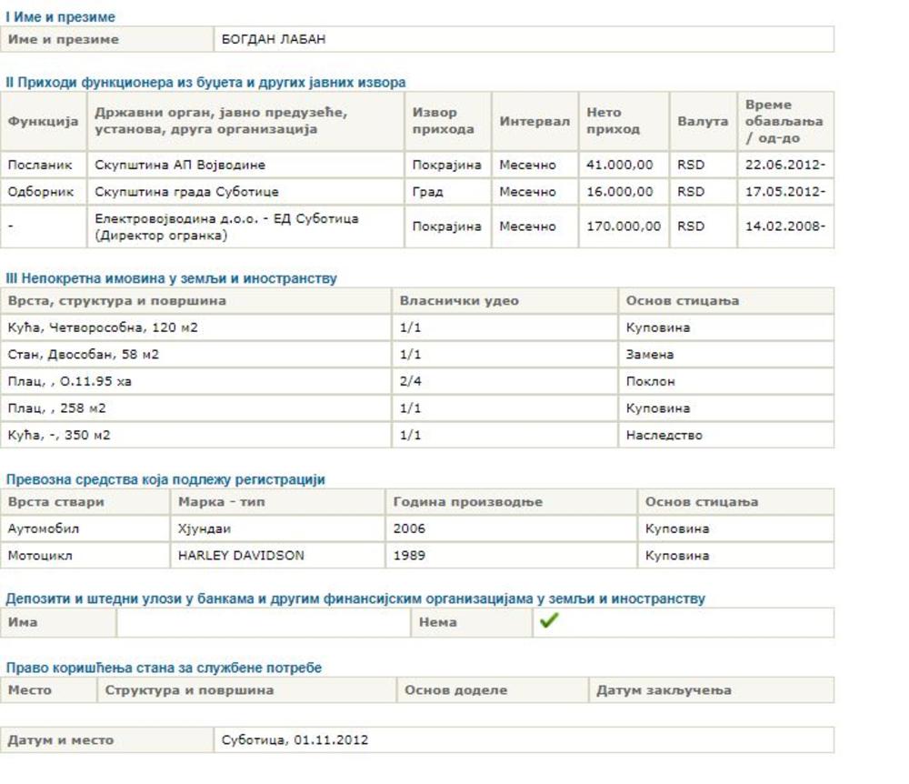 Tako je 1. novembra 2012. godine Laban Agenciji prijavio četvorosobnu kuću od 120 kvadrata koju je kupio, dvosoban stan od 58 kvadrata koji je "zamenio", plac od О.11.95 hektara koji je "dobio na poklon", plac od 258 metara kvadratnih koji je kupio i kuću od 350 kvadrata koju je "nasledio". Laban je tada posedovao i "hjundai" iz 2006. godine koji je kupio, kao i motor "Harli Dejvidson" iz 1989. godine koji je takođe kupio.