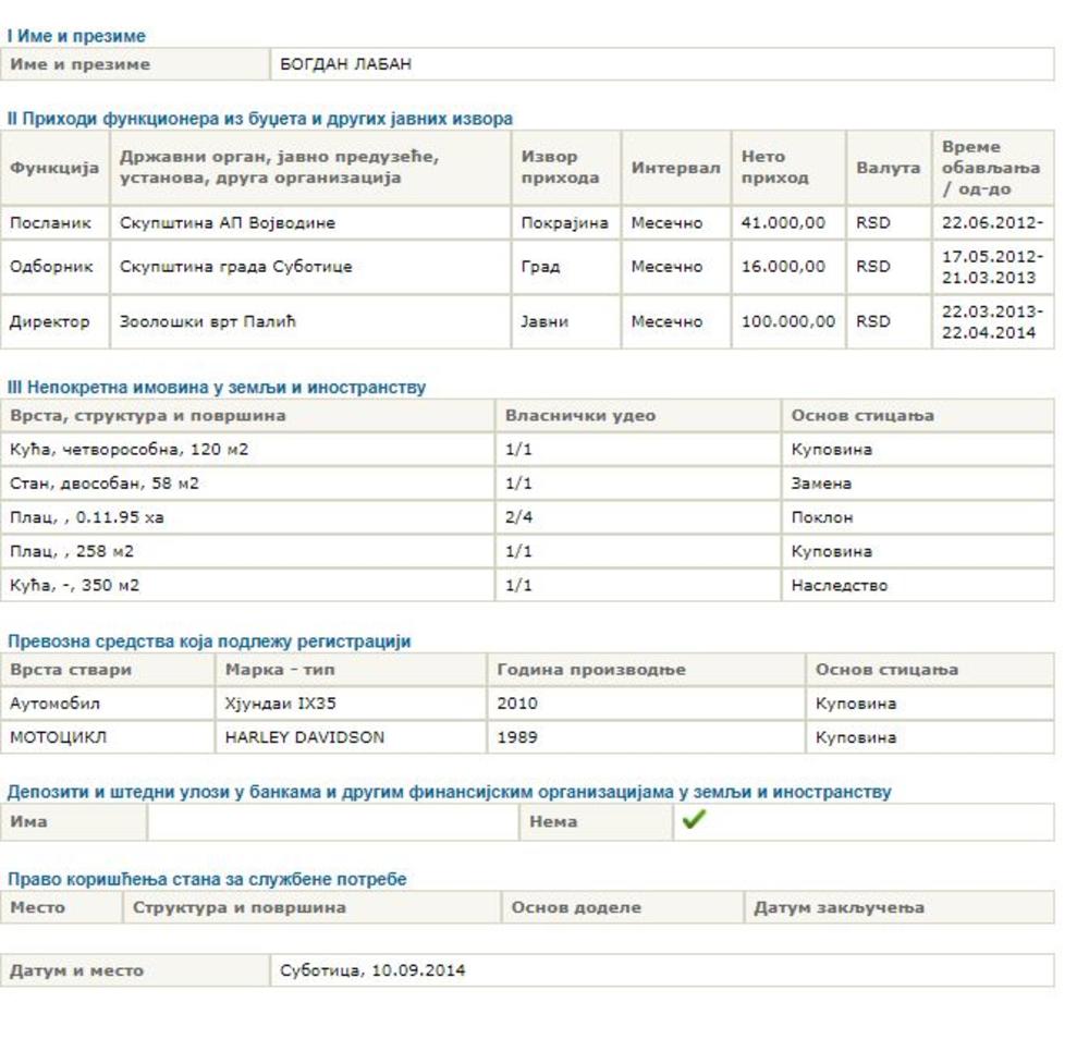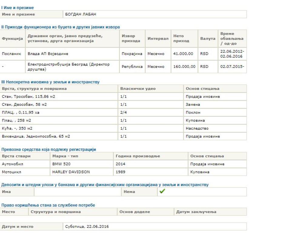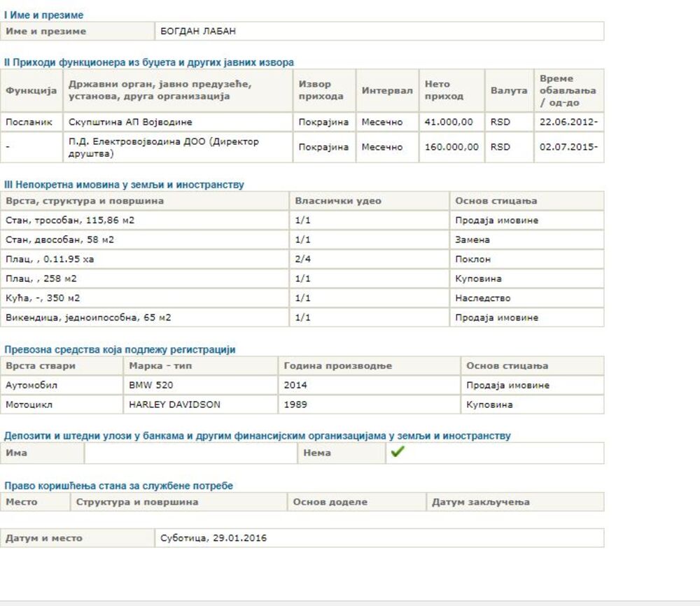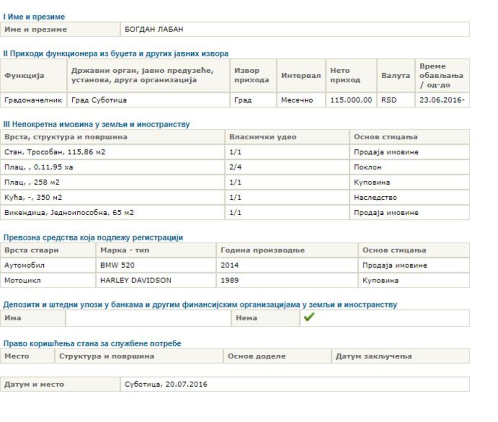 Onda je 29. januara 2016. godine promenio skoro sve. Pored kuće od 350 kvadrata koju je prijavio Agenciji 2012. godine, stana od 58, dva placa, gradonačelnik Subotice 2016. je postao bogatiji za stan od 115,86 kvadrata i vikendica od 65 kvadrata, do kojih je došao "prodajom imovine". Samo nas zanima šta je Laban prodao, ako je na postojeću imovinu dodao stan i vikendicu?! Takođe, prošle godine je "stari BMW" iz 2011. godine zamenio novim, i to BMW 520 iz 2014. godine.