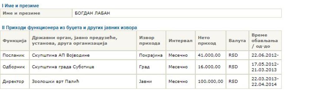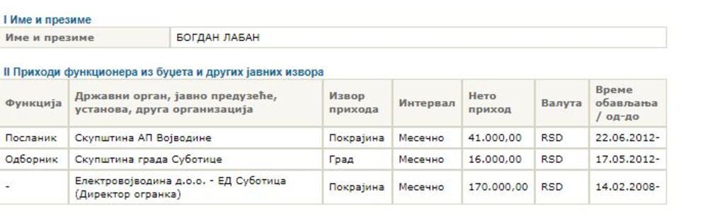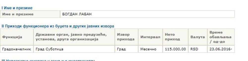 Gradonačelnik Subotice Bogdan Laban, koji je u javnost dospeo preteći profesoru Građevinskog fakulteta Vladimiru Polovini da će mu "iščupati grkljan", od 2012. do prošle godine imao je mesečne prihode iz raznih institucija, a godinama je primao po tri plate!