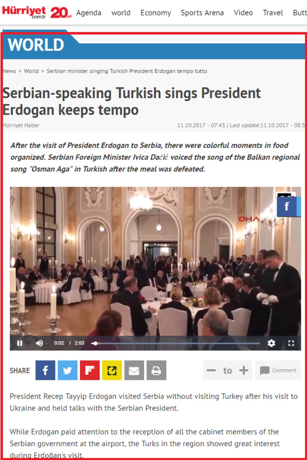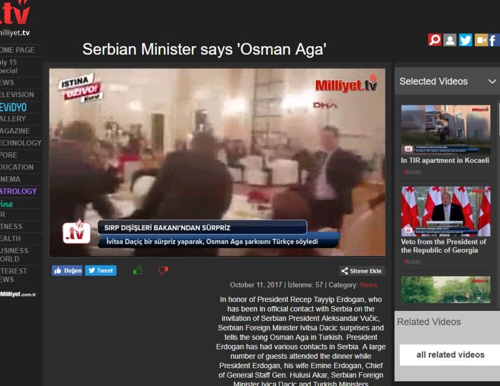 Tako su tamošnji mediji i preneli da je Dačić posle svečane večere preuzeo mikrofon, a potom na lokalnom turskom jeziku otpevao lokalnu pesmu Balkana "Osman Aga".