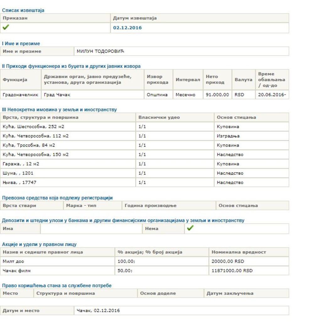 To nije sve. Milun Todorović je 100 odsto vlasnik Društva za transport, trgovinu i usluge "Milt", odnosno firme koja se bavi transportom i špedicijom, a ima i 50 odsto akcija u preduzeću "Čačak film", nominalne vrednosti od 11.871.000 dinara.