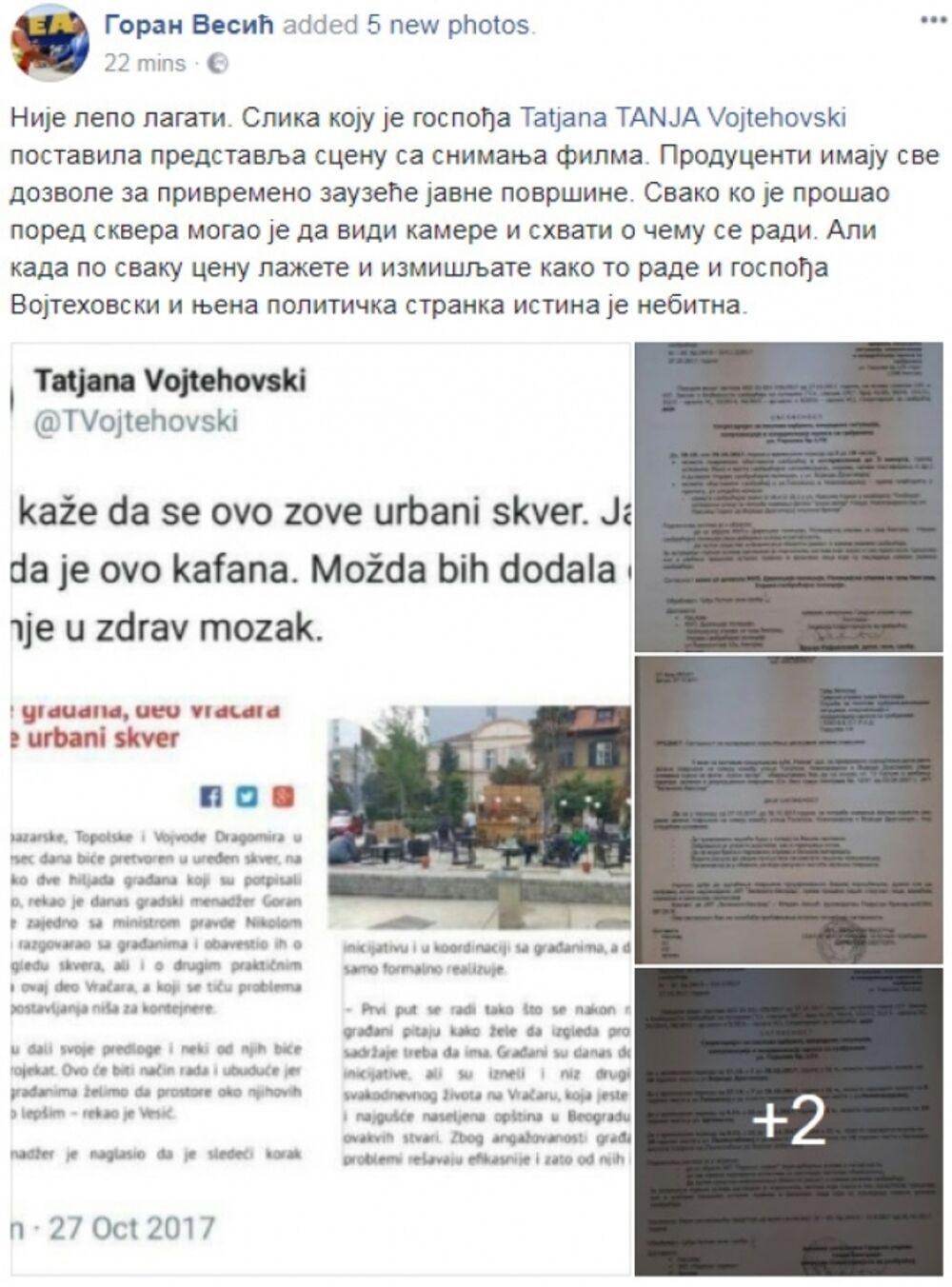 REŠITE PEDOFILIJU U OKVIRU CRKVE I OD*EBITE OD NAŠIH MATERICA! Tatjana Vojtehovski ŽESTOKO odgovorila Irineju (ANKETA) - Nije lepo lagati. Slika koju je gospođa Tatjana TANjA Vojtehovski postavila predstavlja scenu sa snimanja filma. Producenti imaju sve dozvole za privremeno zauzeće javne površine. Svako ko je prošao pored skvera mogao je da vidi kamere i shvati o čemu se radi. Ali kada po svaku cenu lažete i izmišljate kako to rade i gospođa Vojtehovski i njena politička stranka istina je nebitna - napisao je Vesić i priložio dokumente iz kojih se vidi da je ekipa filma imala sve dozvole za snimanje.